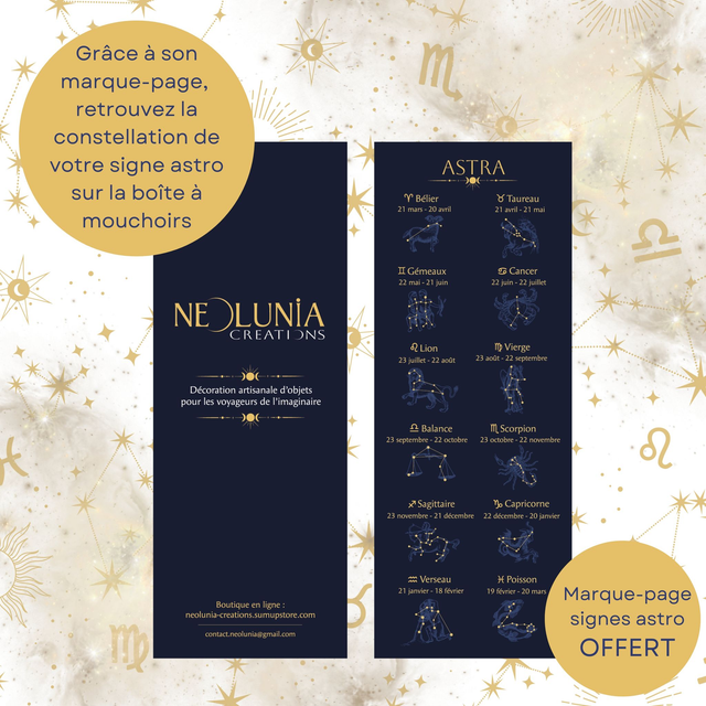 Voyagez au milieu des astres avec la boîte à mouchoir ASTRA. Son format carré est pratique pour les petits meubles et les petites étagères. Peinte à la main, elle arbore les constellations des 12 signes astrologiques. Naviguez avec votre Carte Stellaire : un marque-page qui vous aidera à retrouver la constellation associée à votre signe astrologique.