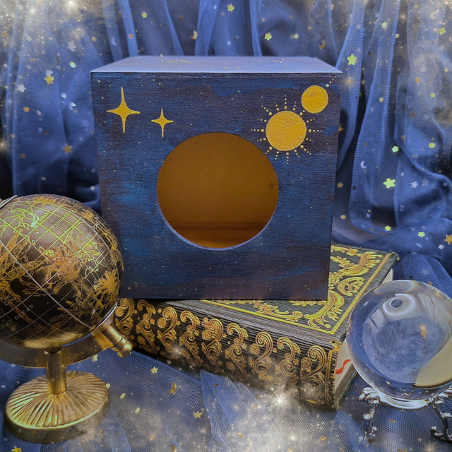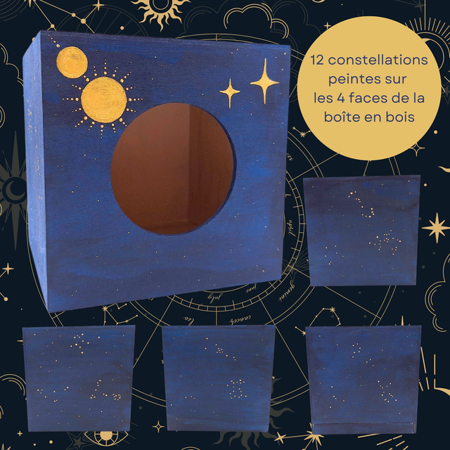 Détails : boîte à mouchoir carrée en bois vendue avec son marque-page constellations et sans mouchoirs. Attention, le rendu peu légèrement différer de la photo (couleurs, nuances, formes des décorations...) car chacune est peinte à la main. L'extérieur de la boîte est peint à la main et l'intérieur de la boîte ainsi que le dessous sont laissés en bois naturel. Une couche de vernis de protection recouvre la totalité de la boîte en bois, afin de protéger la peinture et de permettre un nettoyage de la poussière avec une éponge propre et humide.