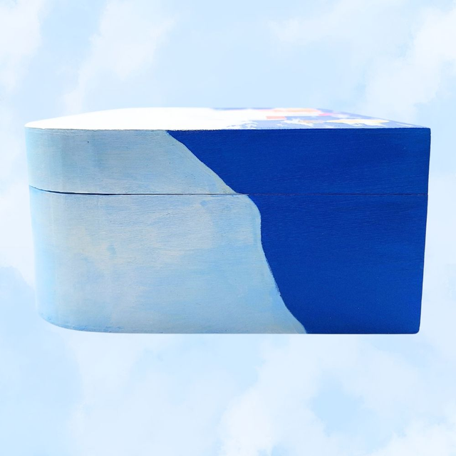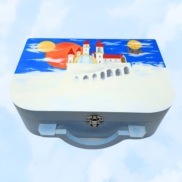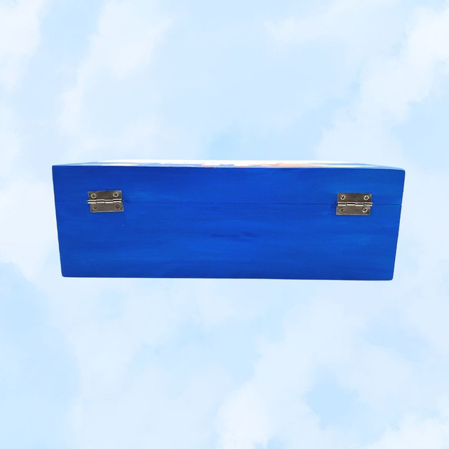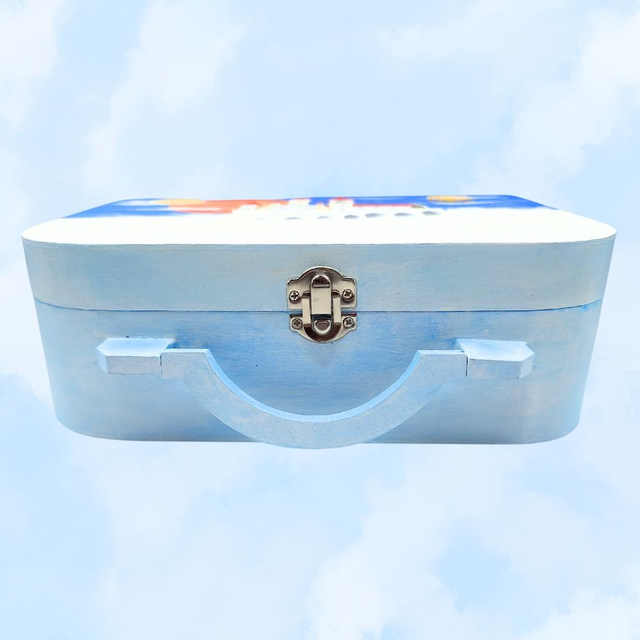 Détails : Valisette en bois avec fermoir et poignée en bois. L'extérieur de la valisette est peint à la main. Une couche de vernis de protection recouvre la totalité de la valisette en bois, afin de protéger la peinture et de permettre un nettoyage de la poussière avec une éponge propre et humide.